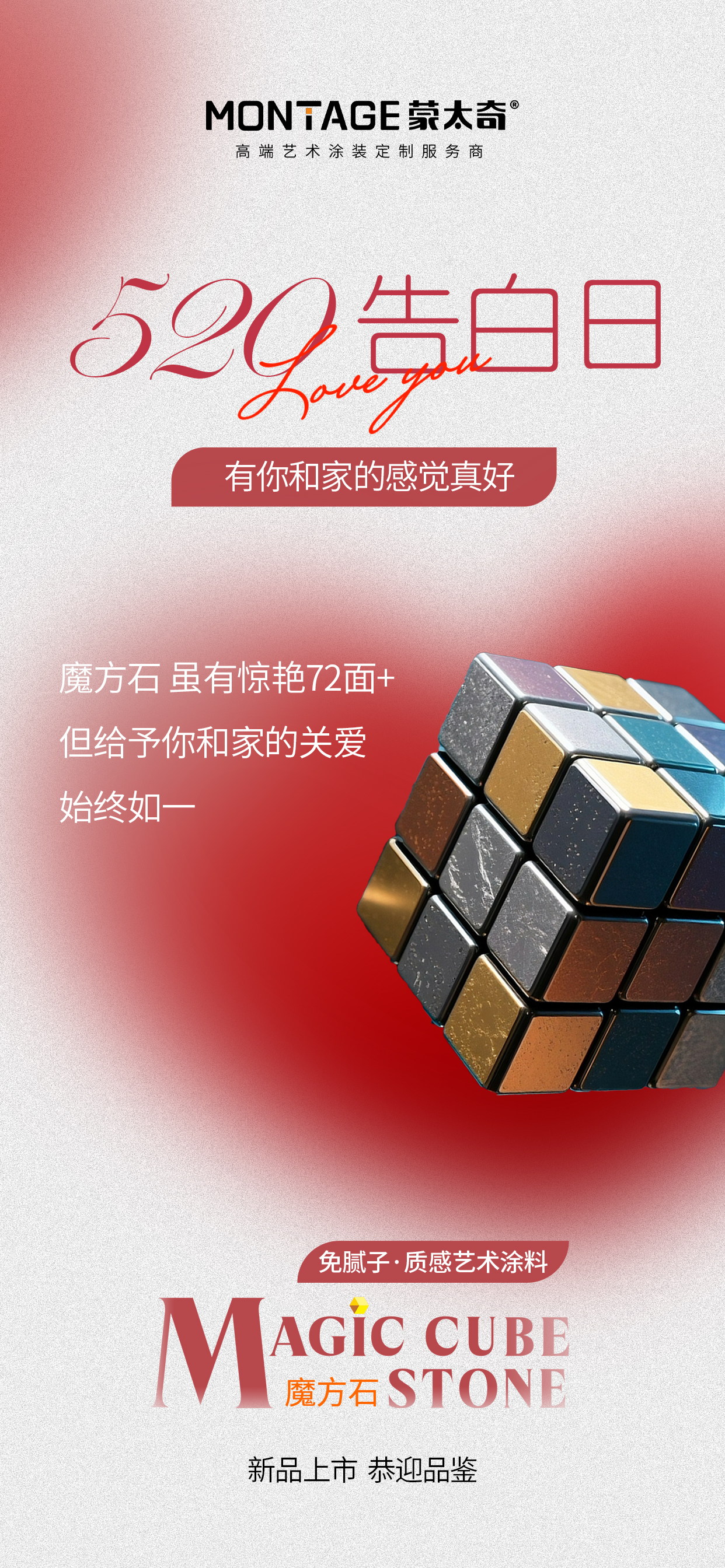520 告白日是對所有「愛」的溫柔回應 —— 愛家人的三餐四季,愛自己的棲居理想,愛生活的細水長流。而家,作為承載愛的容器,每一寸墻面都是情感的底色。蒙太奇魔方石藝術漆讓墻面不是冰冷的屏障,而是愛家的情緒表達,用驚艷72面+,打磨出365天的溫柔守護。