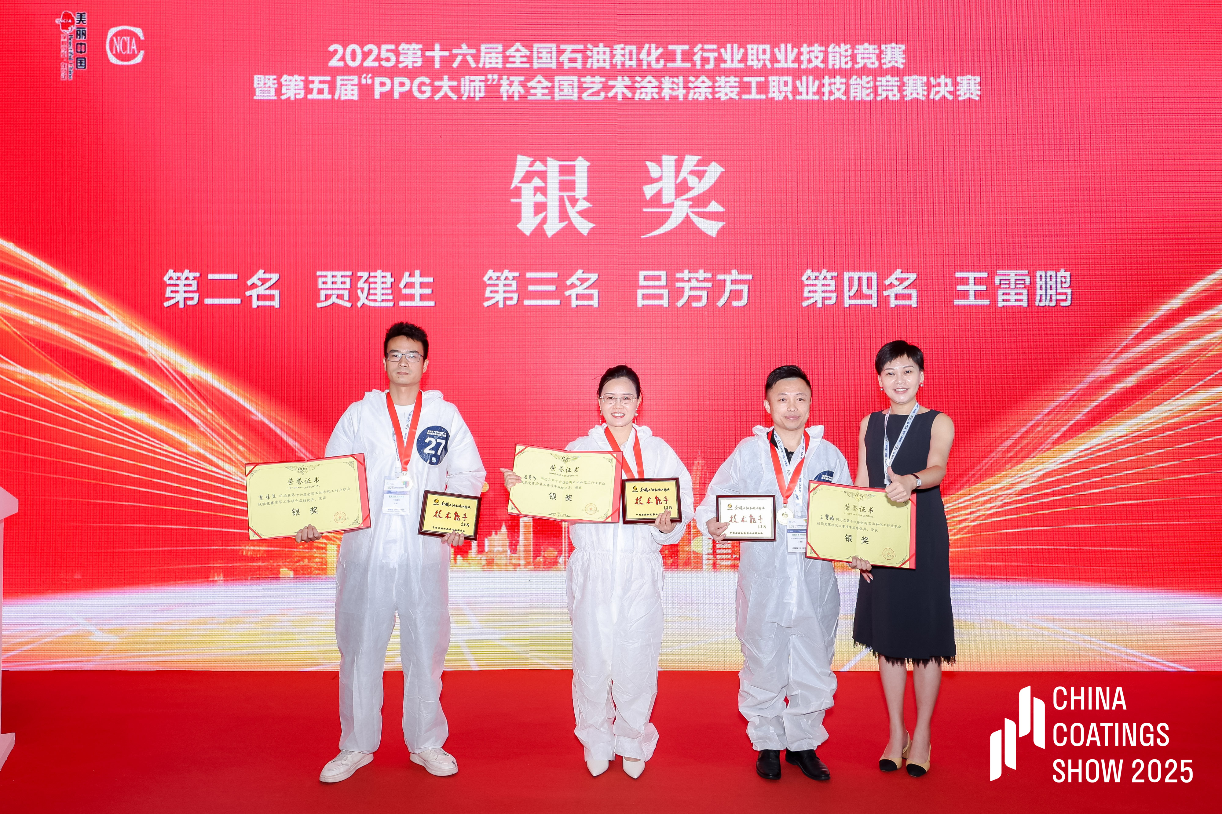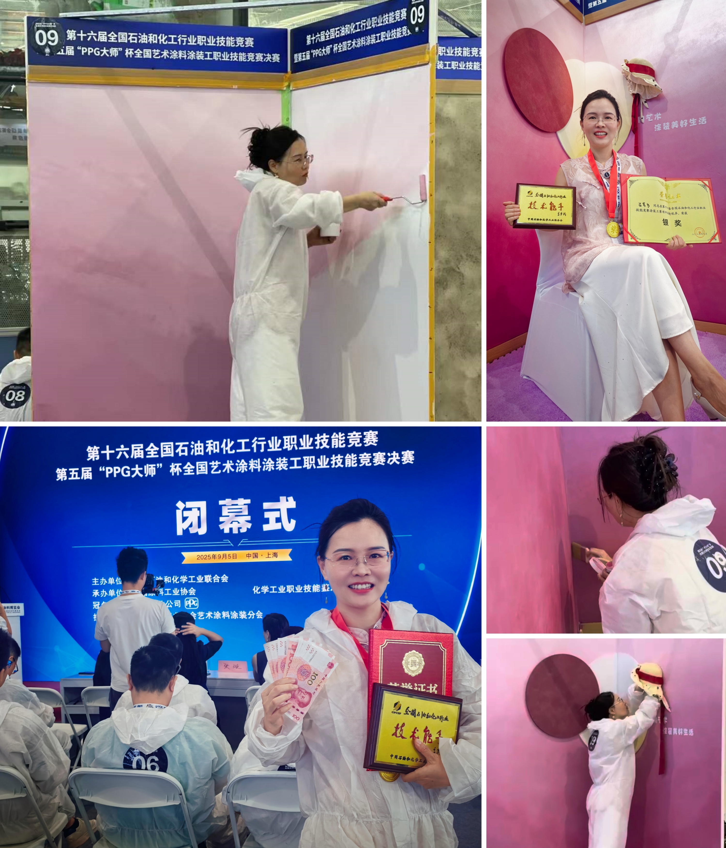 在幾天激烈的角逐中,蒙太奇藝術(shù)漆以"理論+實(shí)操"雙優(yōu)表現(xiàn)驚艷全場。由蒙太奇董事長趙廣全先生與蒙太奇聯(lián)合創(chuàng)始人、藝術(shù)涂料最美老板娘呂芳方女士作為代表參賽,憑借對藝術(shù)涂料前沿趨勢的深刻洞察與精湛技藝,與全國30名優(yōu)秀墻藝師同臺競技,從初賽到?jīng)Q賽一路過關(guān)斬將,最終以總分第三名的成績榮膺第五屆“PPG大師”杯銀獎。