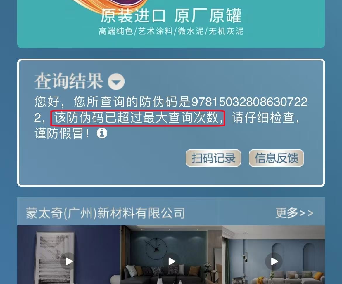 若結果顯示“是蒙太奇(廣東)新材料有限公司生產的正品”,請再核對查詢結果顯示的防偽碼與產品包裝上的防偽碼是否一致,若顯示以下信息,則該產品為官方正品。