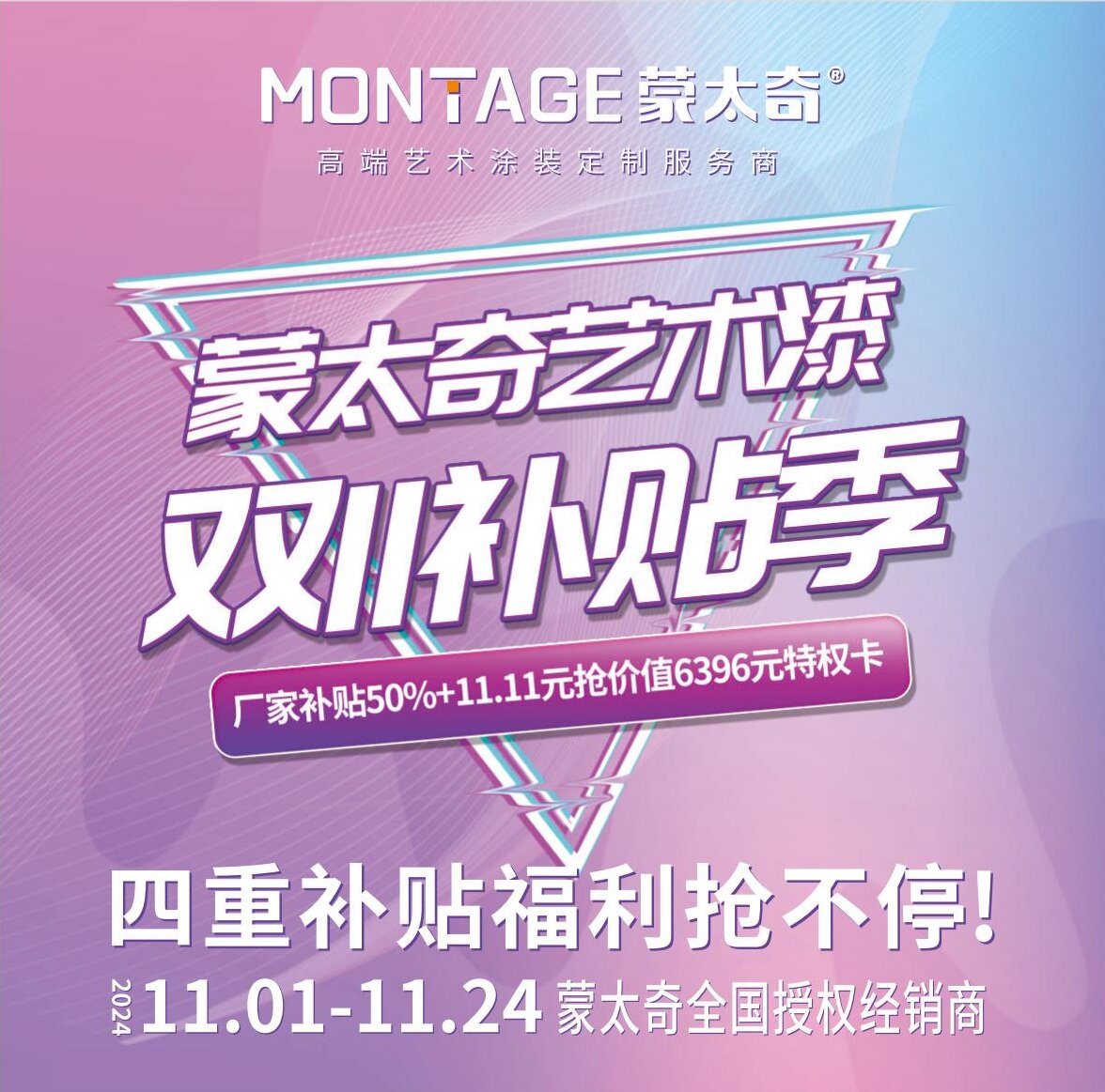 快把好消息傳開!有新房裝修或者老房改造需求的朋友有福了!蒙太奇推出雙11補貼季活動,不管是裝新家還是舊房煥新,都能享受廠家直接補貼,真正享受活動優惠。補貼又逢雙11,折上再折不容錯過!我們提供多重免費、VIP煥新等承諾,用優惠的價格享受高品質,雙11來蒙太奇一次省到底,幫您輕松拿下全屋藝術涂裝。